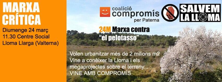 El próximo domingo 24 de marzo Compromís per Paterna convoca la marcha crítica ‘Salvem la Lloma’, para explicar in situ el impacto medioambiental que supondrá la implantación de la Zona Franca y del centro comercial Puerto Mediterráneo, si llegan a convertirse en realidad.